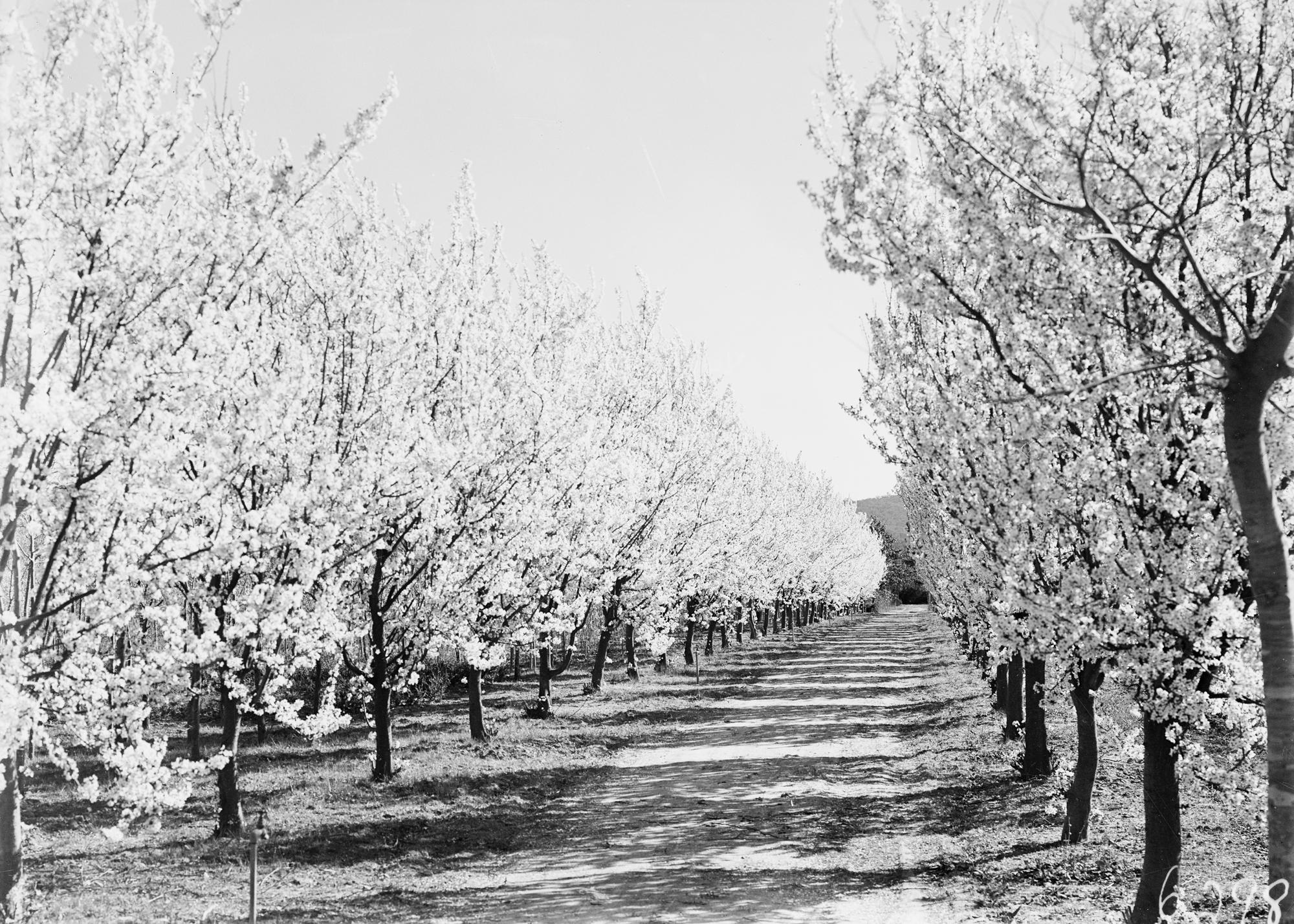 Flowering peach trees in bloom, Yarralumla Nursery.