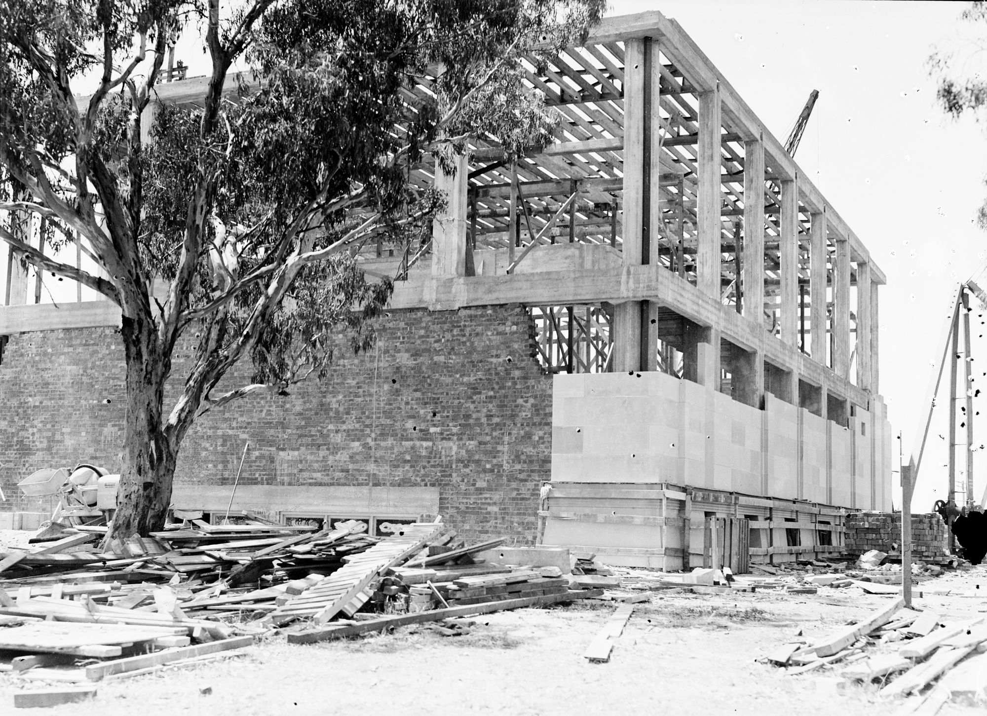 Australian Institute of Anatomy under construction. Fitting the sandstone finish. McCoy Circle, Acton