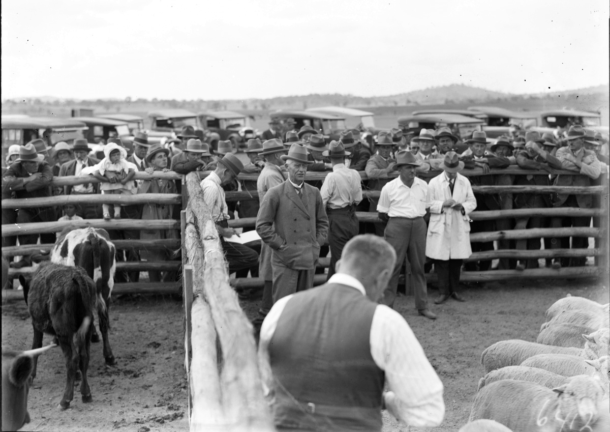 Spectators and bidders at a sheep auction sale.