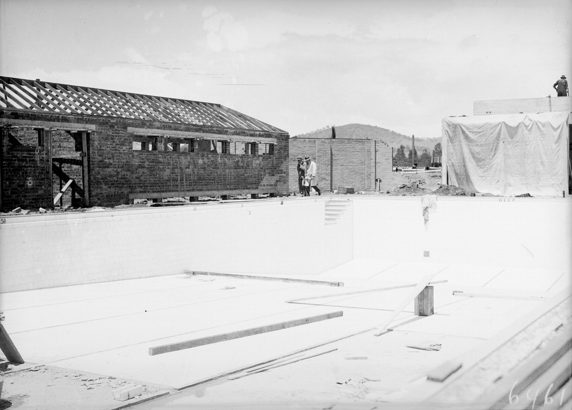 Manuka swimming pool under construction. Tiling now complete. Manuka Circle, Kingston.