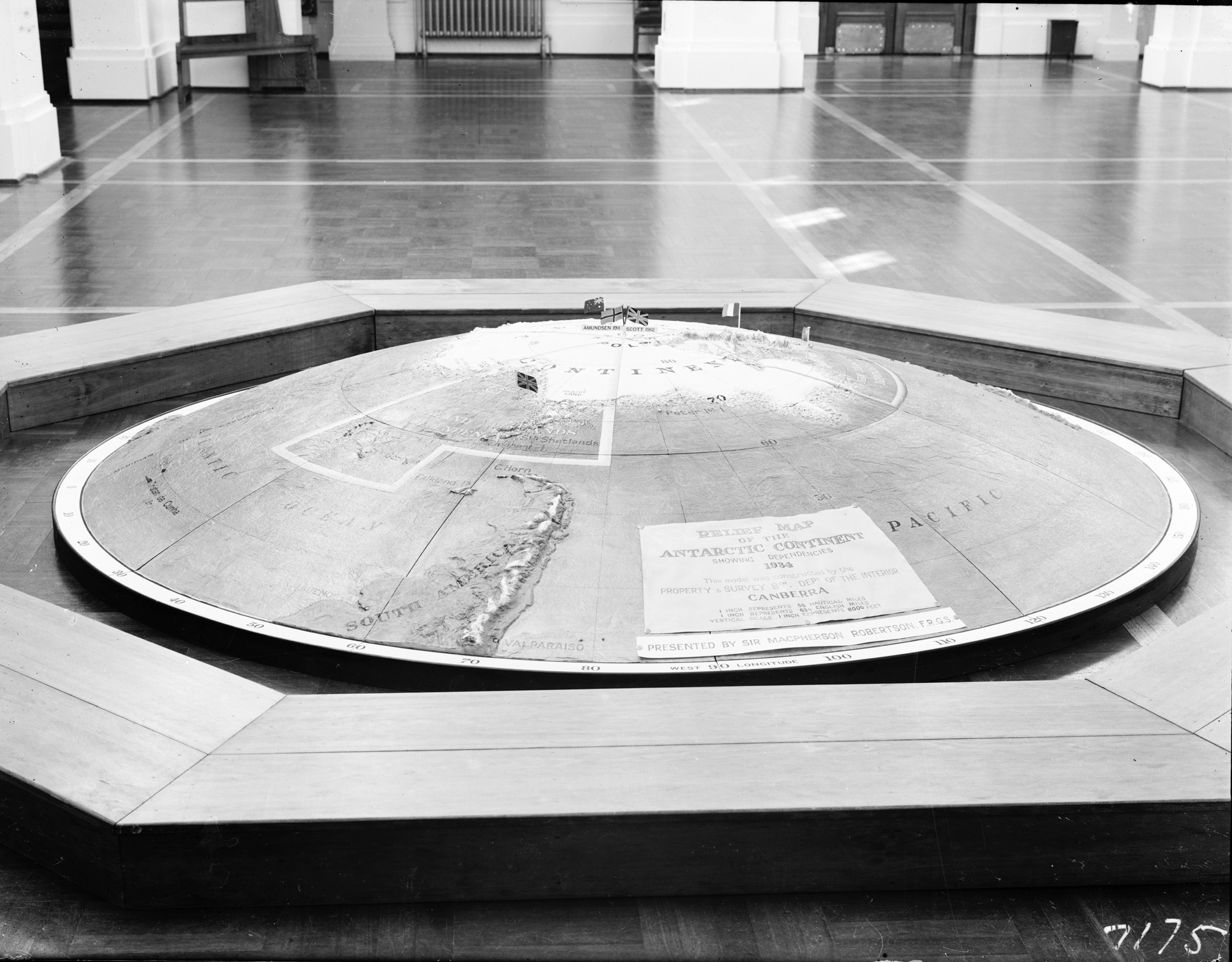 Model of a relief map of the Antarctic continent. Progress of exploration in the Antarctic on display in Parliament House. Presented by Sir Macpherson Robertson.