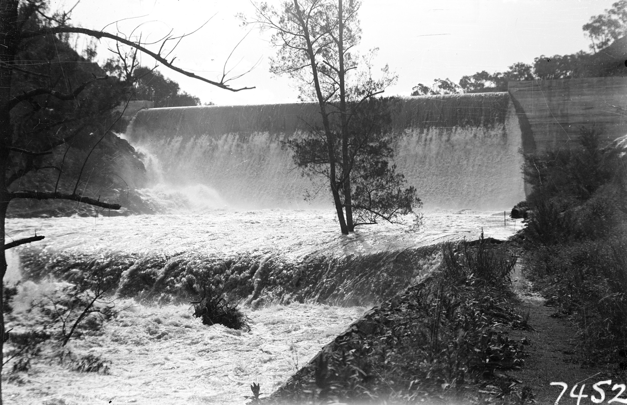 Cotter Dam. Spillway over flowing in flood into the stilling pond.