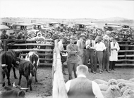 Spectators and bidders at a sheep and cattle auction sale.