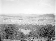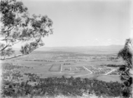 View from Red Hill over Barton and Kingston to Duntroon. Observatory dome on Mt. Pleasant. Kingston Power Station on right, Kurrajong Hotel in centre.