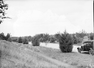 Trees in Wentworth Avenue, Kingston. Kingston Power Station roof in centre. Mildenhall's car on right.
