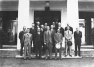 Group of people talking at the opening of new Golf Club House. Includes Canon Edwards, Headmaster of Canberra Grammar School, and Captain Bracegirdle.