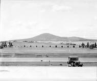 View to north and Mt. Ainslie from Parliament House doorway. Mildenhall's Armstrong Siddeley car in front.