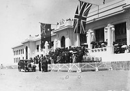 Opening of Church of England Mens Society -Prime Minister , Right Honourable SM Bruce, Sir George Pearce and Governor-General, Lord Stonehaven, at entrance to the Australian Forestry School, Banks St., Yarralumla