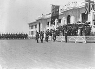 Armistice Day - Official Party entering Parliament House steps with Spectators